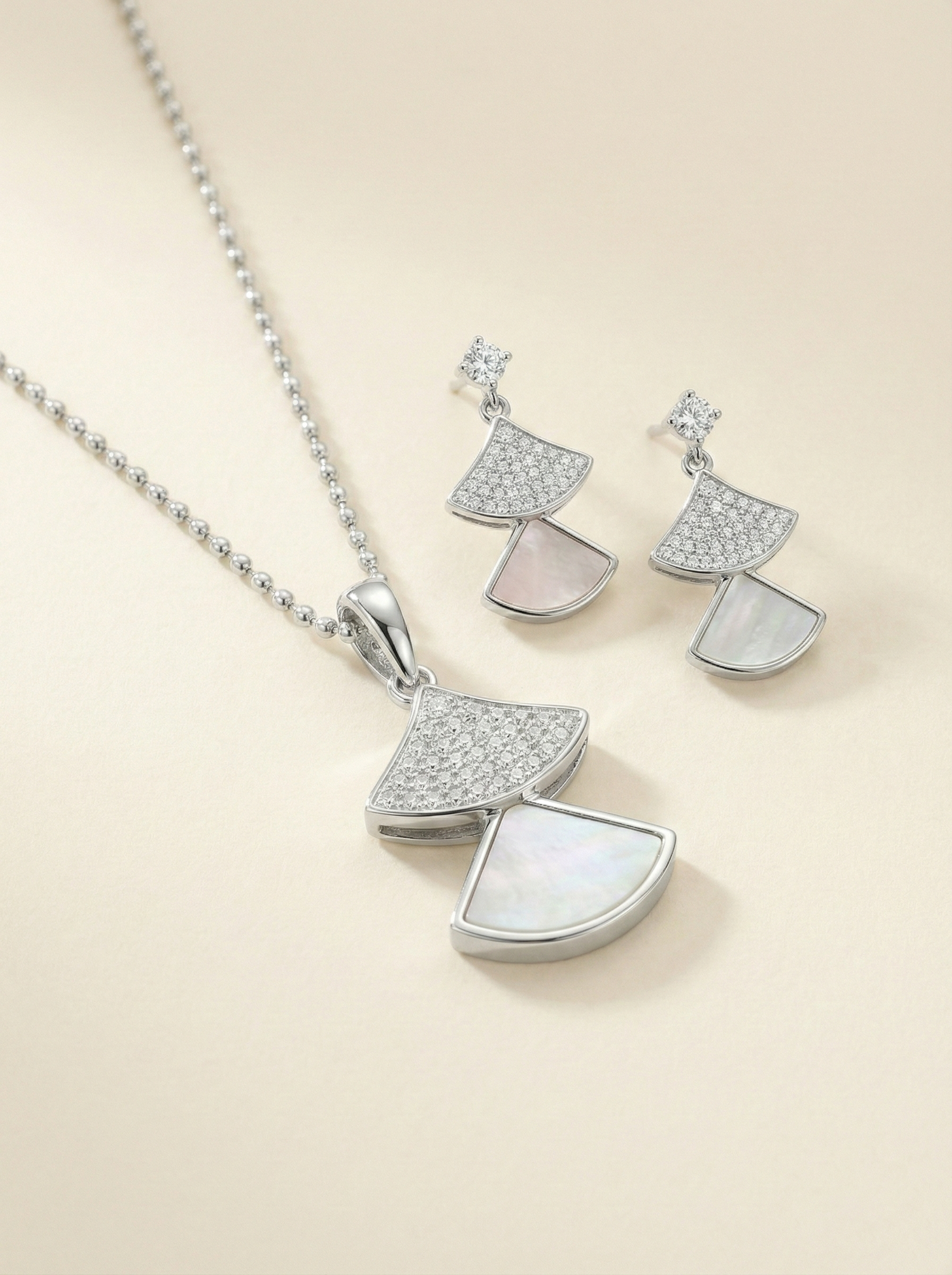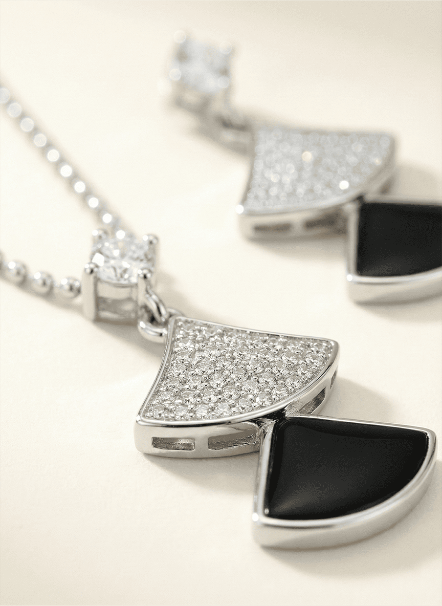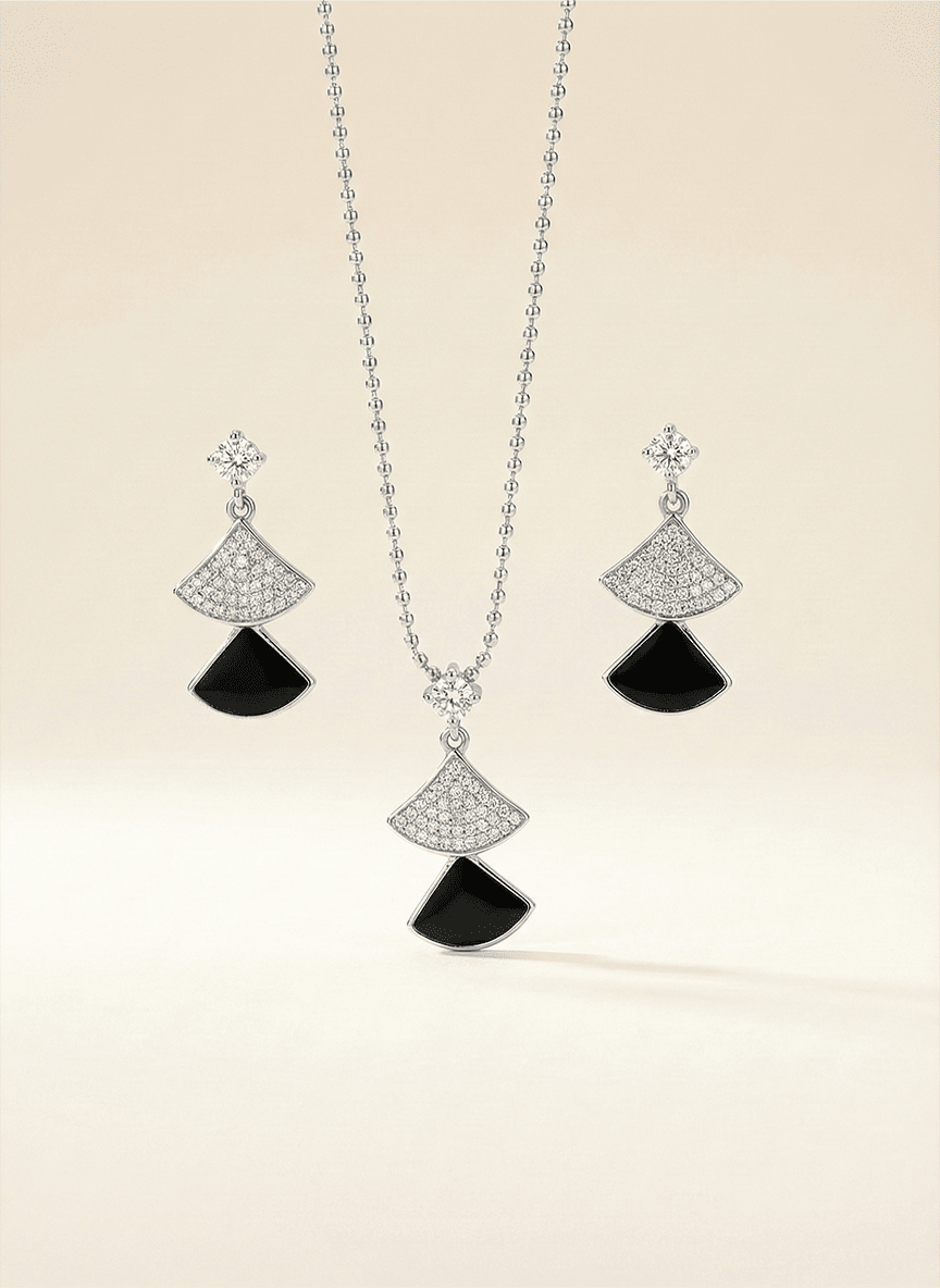 Capturing the high-contrast glamour of the 1920s, the Midnight Mosaic Art Deco Fan Set is a study in geometric elegance. This coordinated suite features a tiered fan silhouette—a classic architectural motif reimagined for the modern woman. Each piece juxtaposes the brilliant, light-catching sparkle of hand-set micro-pavé stones against the deep, light-absorbing intensity of polished black inlays.