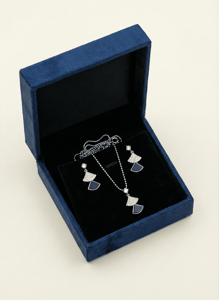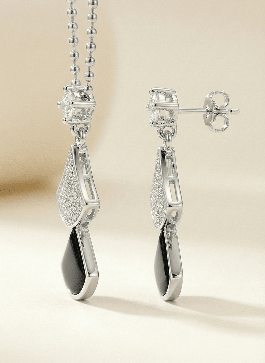 Crafted in premium 925 sterling silver, the pendant hangs gracefully from a delicate bead chain, mirrored perfectly by the matching drop earrings. Whether paired with a crisp white blouse for a sharp daytime look or a velvet evening gown, this set offers a "noir" sophistication that is both timeless and strikingly bold.