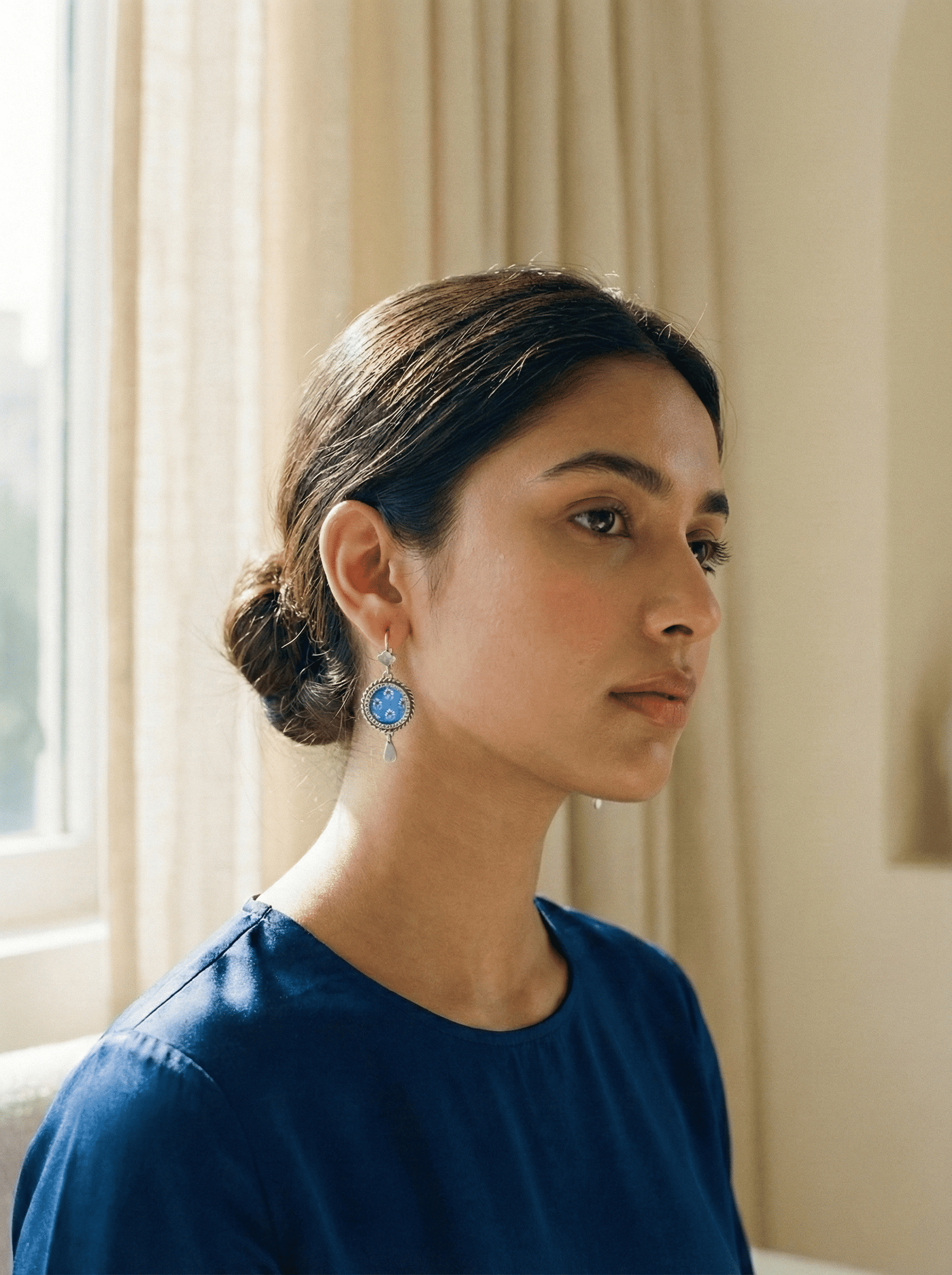 A soulful blend of vintage charm and artisanal precision, the Azure Blossom earrings are designed for the woman who appreciates the "slow-made" heritage of fine jewelry. Each pair tells a story through its vibrant sky-blue enamel, serving as a canvas for delicate, hand-painted floral motifs that capture the essence of a garden in bloom. Encased in a handcrafted sterling silver rope frame and finished with a graceful teardrop dangle, these earrings offer a sophisticated pop of color that transitions effortlessly from sun-drenched afternoons to candlelit evenings.