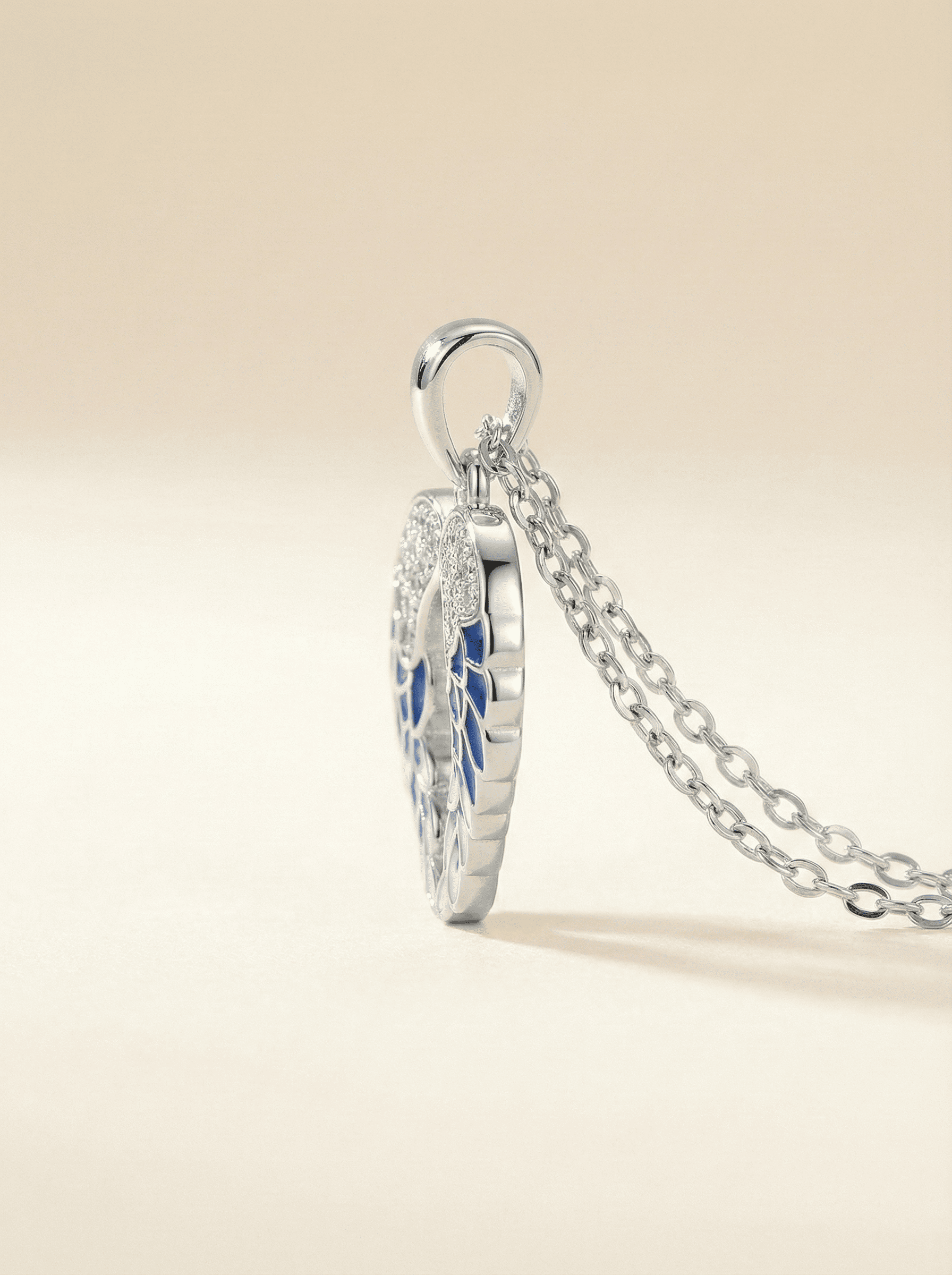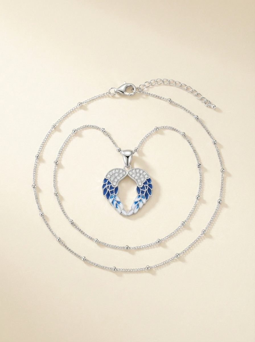 A masterclass in artisanal jewellery, this piece combines symbolic silhouette with a vibrant, modern palette. Featuring hand-applied enamel that transitions from deep midnight blue to a crisp, ethereal white, the Azure Seraphic Wings Heart Necklace is designed to catch the light and the eye.