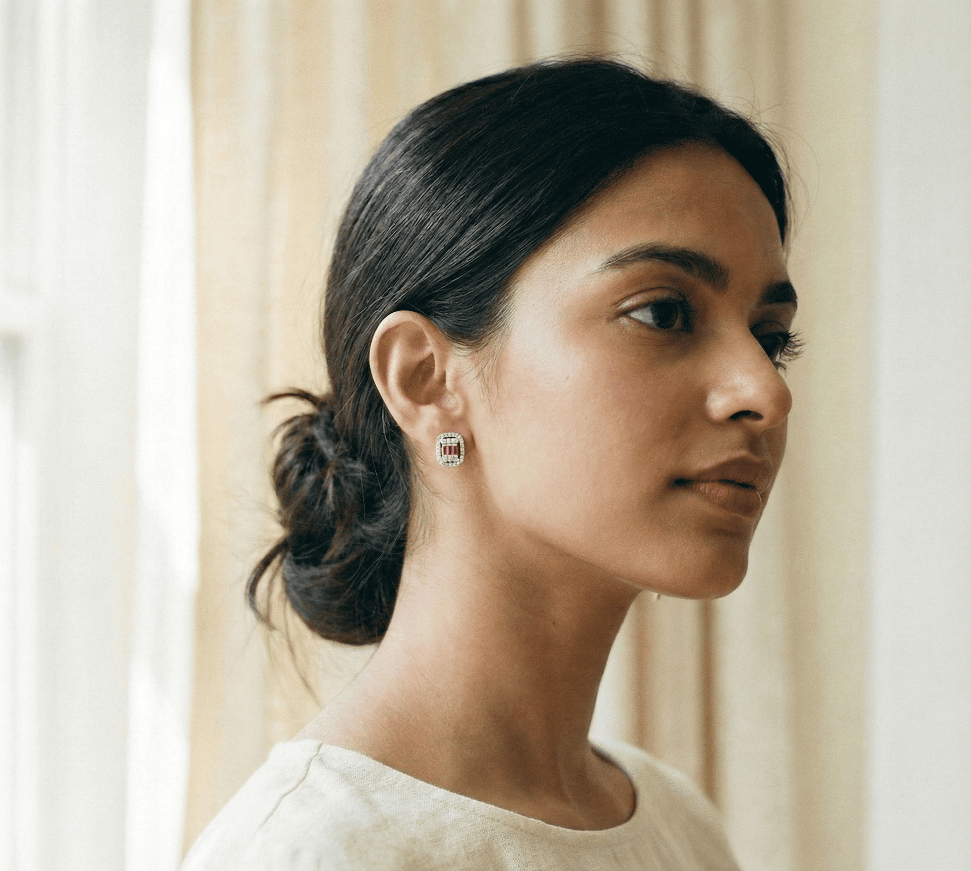 • Compact Art Deco Silhouette: A refined, rounded-rectangular form inspired by vintage architectural elegance, designed to sit perfectly flush against the earlobe.