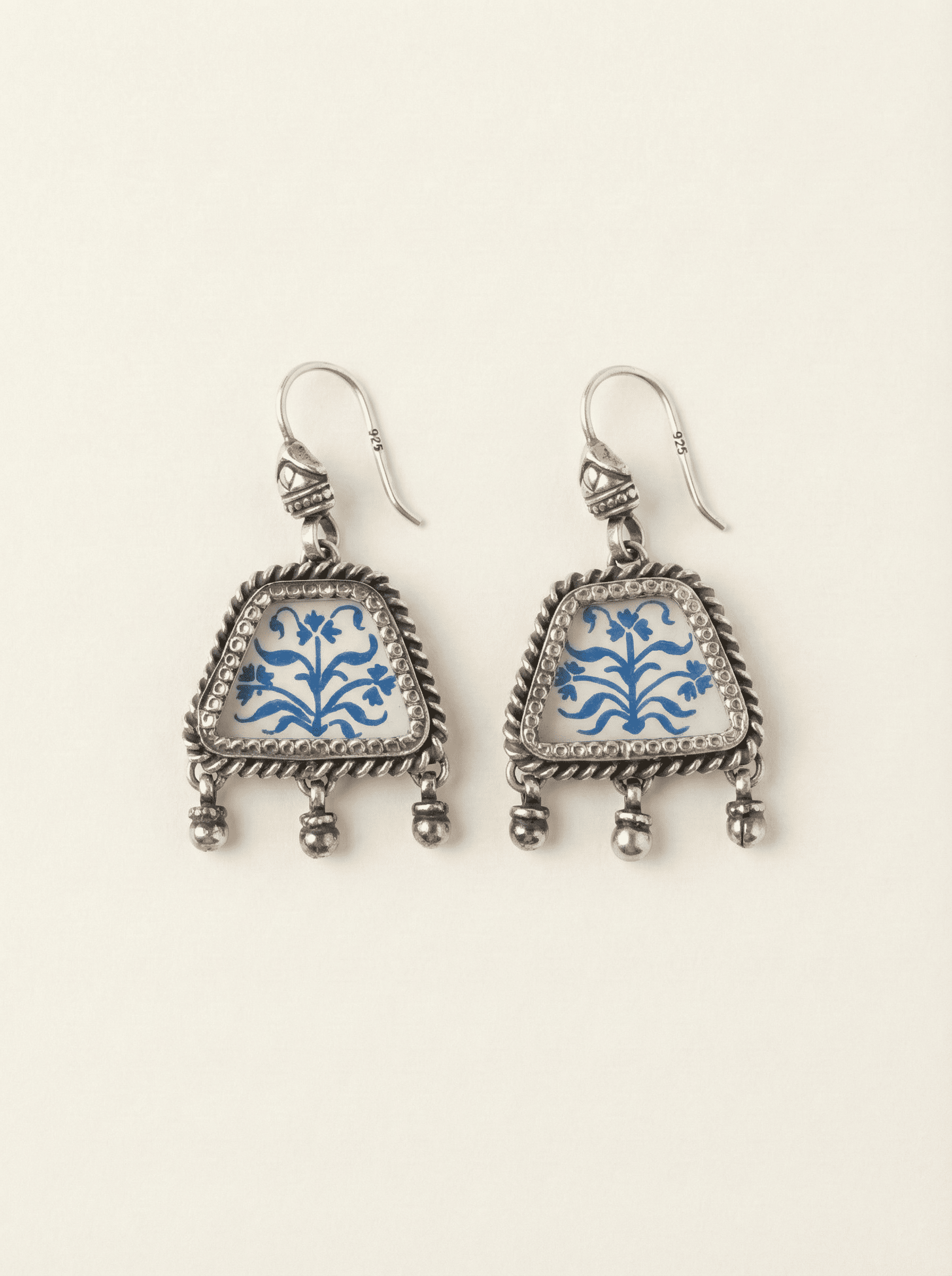 Embrace the timeless allure of artisanal craftsmanship with "The Cobalt Garden" drop earrings. These exquisite pieces blend polished 925 sterling silver with the captivating charm of hand-painted ceramic. Inspired by traditional blue pottery patterns, the intricate floral motifs in deep cobalt contrast beautifully against a crisp white backdrop, all framed by textured silver rope detailing. Finished with graceful silver bead drops that add gentle movement, these earrings offer a unique statement of heritage elegance for any occasion.