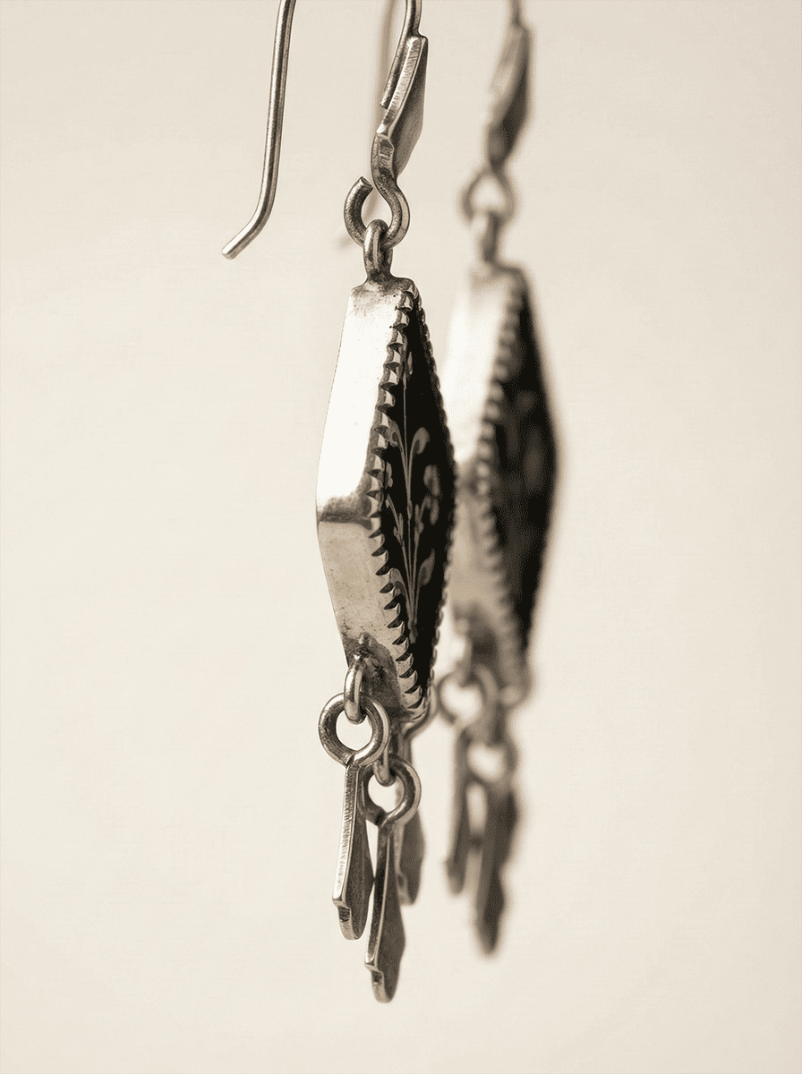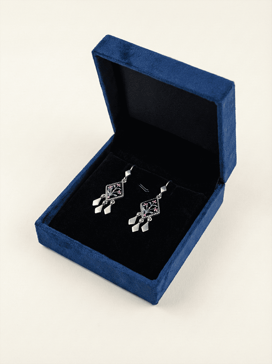The Gul-e-Noor (Flower of Light) earrings are a masterclass in wearable art, bridging the gap between heritage craftsmanship and contemporary elegance. Each piece features a striking hand-painted floral motif, reminiscent of traditional Mughal botanical illustrations, meticulously detailed against a deep, light-absorbing black inlay. The architectural rhombus silhouette is finished with a rhythmic trio of silver teardrops that catch the light with every movement, creating a sophisticated play of shadow and sheen. Whether paired with an evening gown or a structured blazer, these earrings serve as a conversation-starting statement of refined taste.