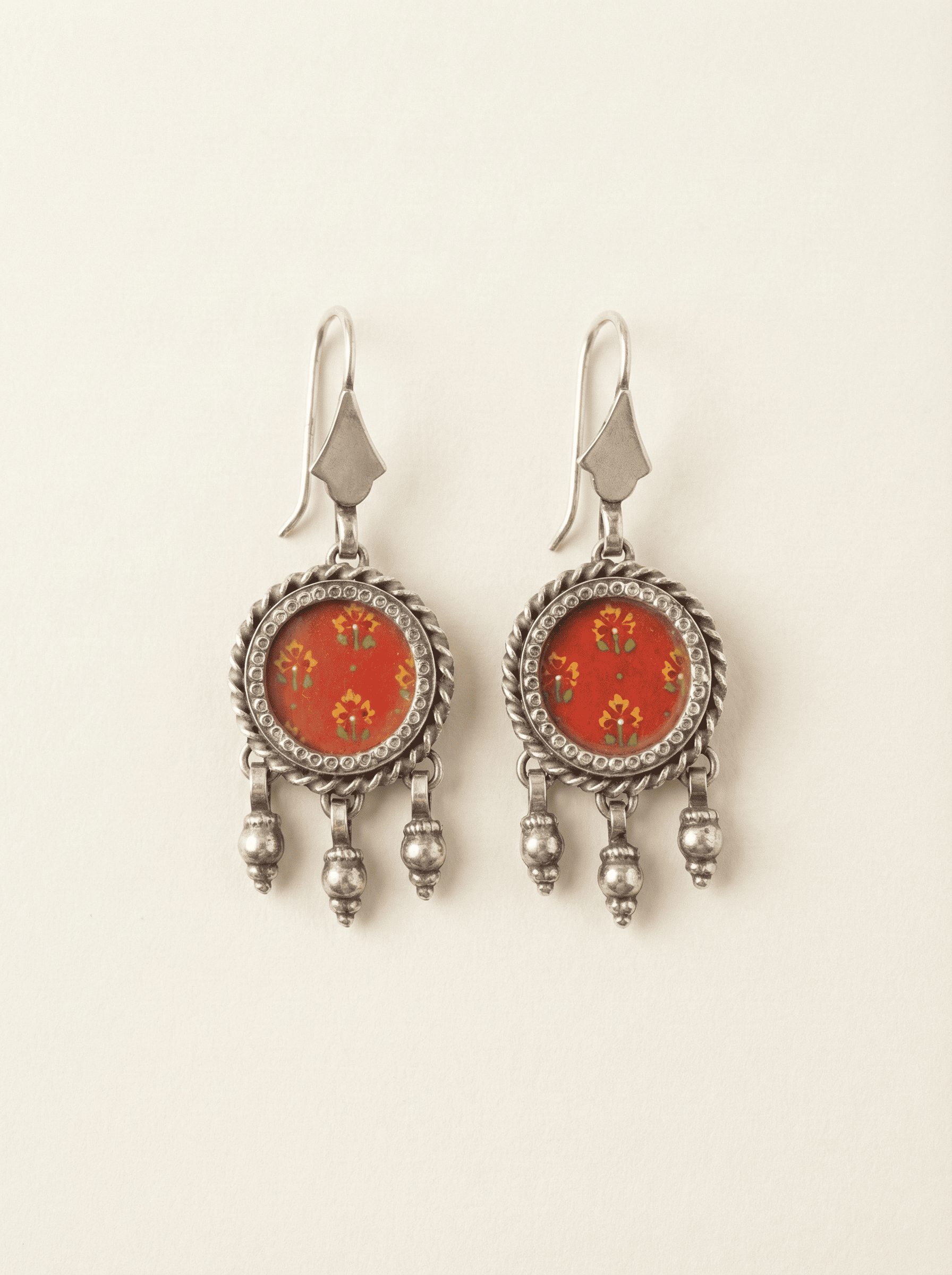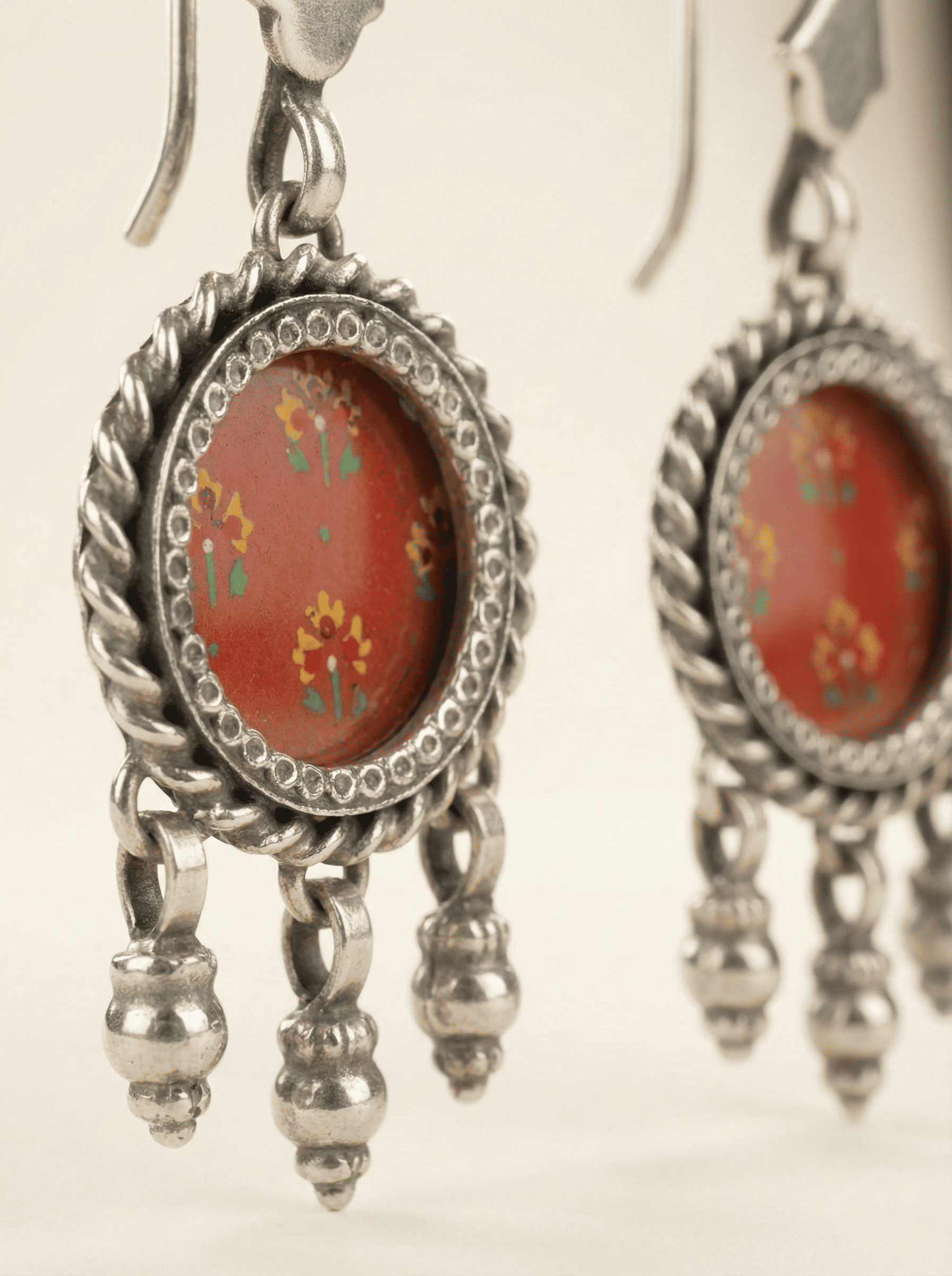 Step into a world where heritage artistry meets vintage allure with our Hand-Painted Crimson Floral Earrings. Each piece is anchored by a vibrant crimson centerpiece, meticulously hand-painted with delicate floral blossoms that evoke the charm of traditional miniature art. The design is encased in a high-contrast, oxidized 925 sterling silver frame, featuring a traditional twisted rope border that adds architectural depth and a weathered, antique character to the silhouette. Three articulated silver dangles complete the look, offering fluid movement and a bohemian-luxe chime that catches the eye with every turn of the head. Designed for those who appreciate the weight of quality and the soul of handcrafted jewelry, these earrings are a timeless statement of elegance.