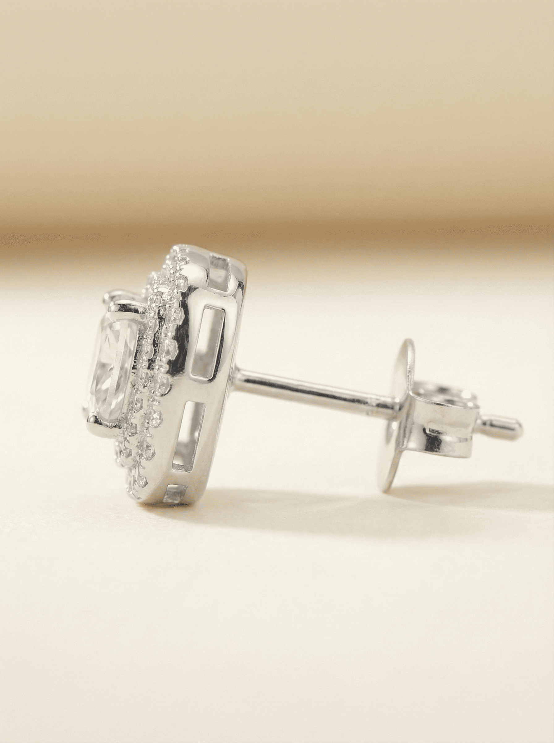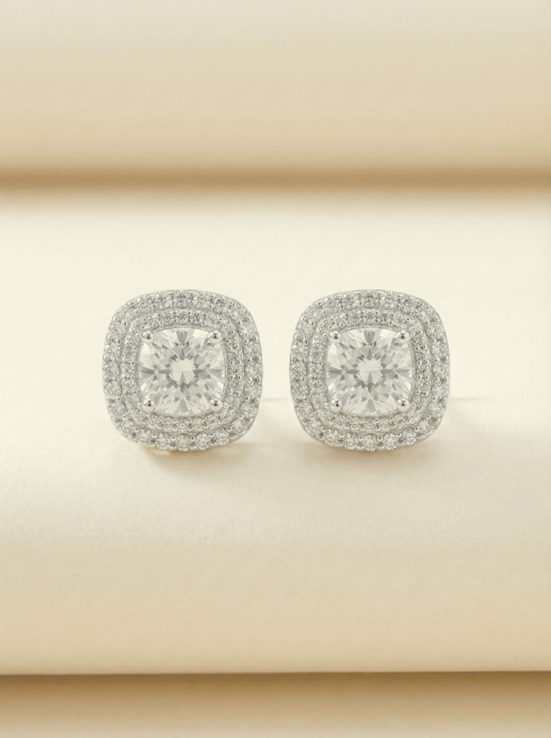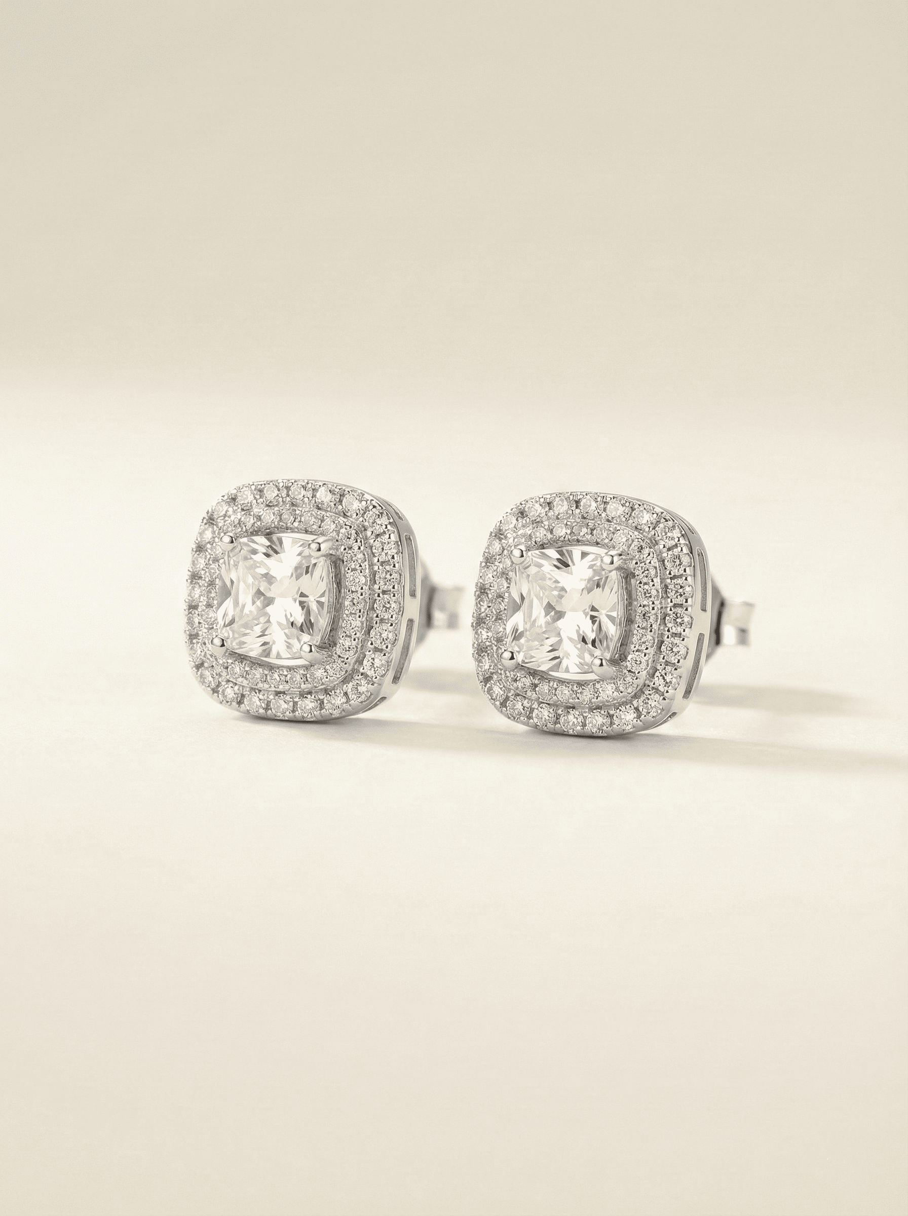 Elevate your jewellery repertoire with the undeniable brilliance of our Luminous Cushion-Cut Double Halo Stud Earrings. Masterfully crafted from polished 925 sterling silver, these architectural studs feature a captivating cushion-cut centrepiece, expertly framed by a sophisticated double halo of pavé-set stones. The intricate design maximizes light reflection, creating a mesmerizing dance of sparkle designed to transition seamlessly from refined daytime polish to evening glamour.