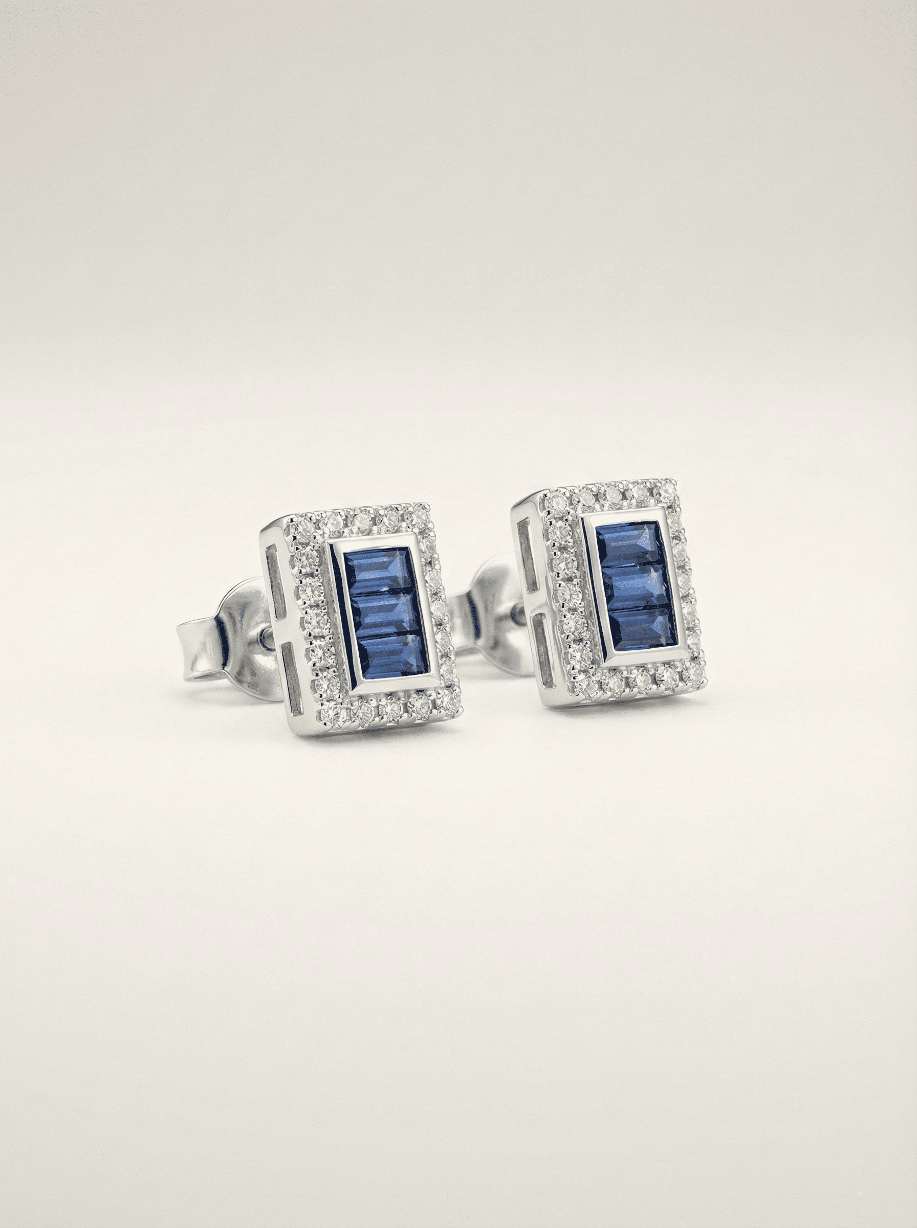 Evoke the sophistication of Art Deco architecture with the Midnight Azure Trio Baguette Studs. These earrings feature a striking triptych of deep blue stones, framed by a brilliant halo of light-catching accents, designed for the woman who appreciates timeless geometry and artisanal detail.