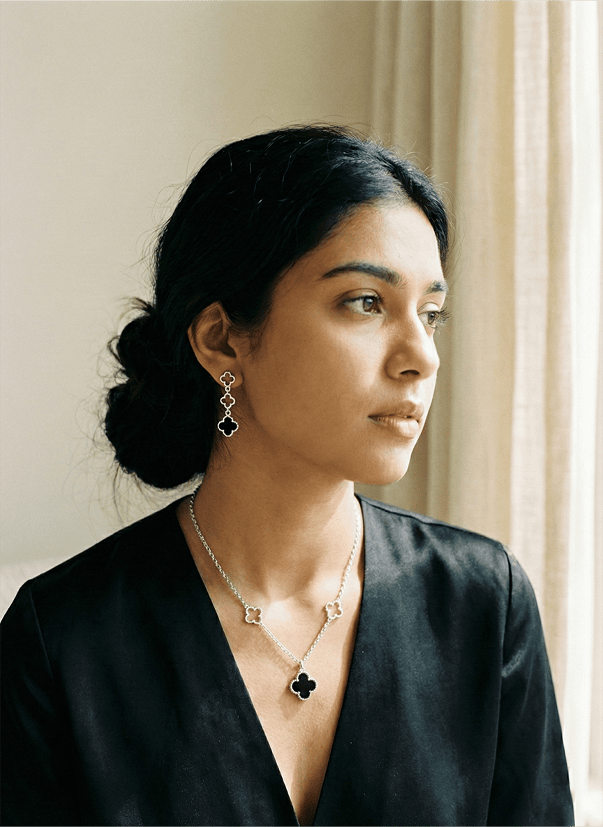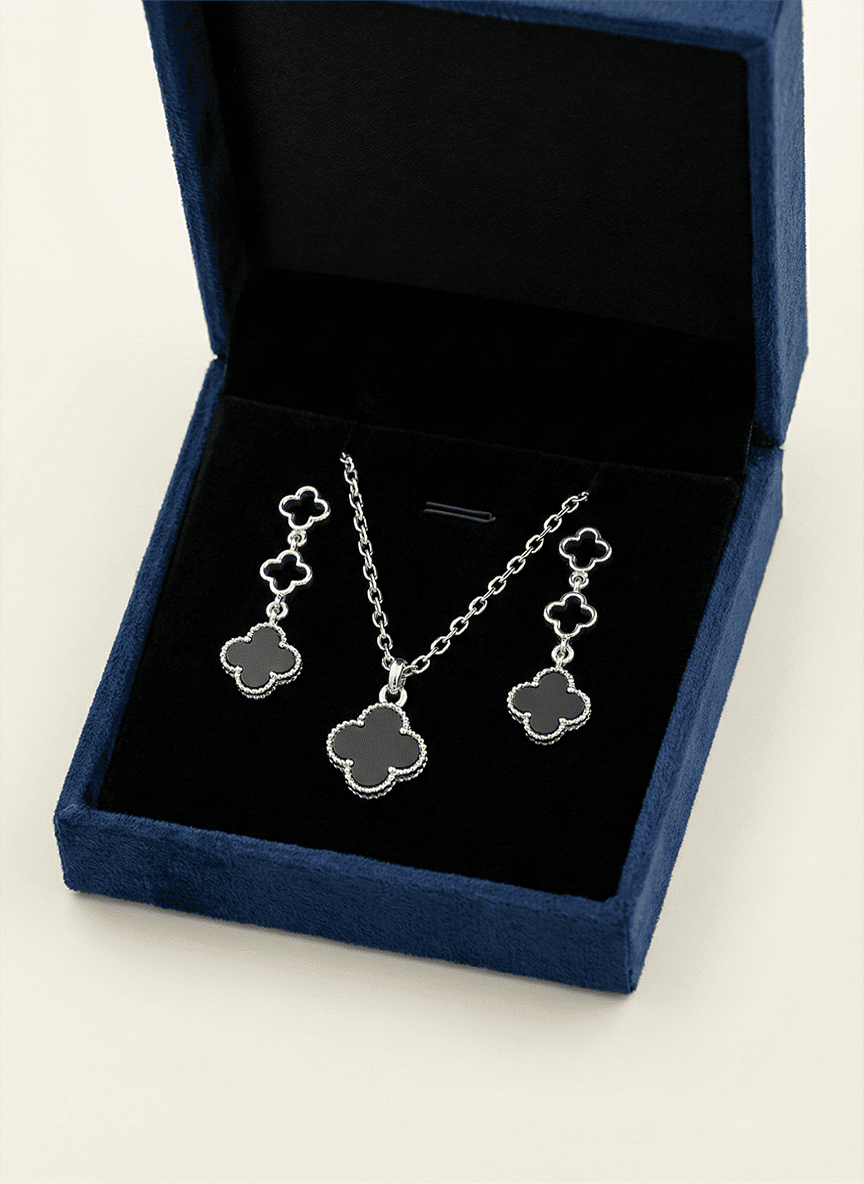 Elevate your collection with a modern masterpiece that redefines a timeless motif. The Noir Clover Open-Link Ensemble is an exercise in balance—pairing the bold, grounded presence of midnight black accents with the ethereal lightness of architectural "empty" clover frames. Handcrafted in premium 925 sterling silver, this set is designed for the woman who appreciates jewellery that feels both structurally significant and effortlessly delicate. Whether worn as a refined daily signature or a minimalist evening statement, it captures light and shadow with every movement.