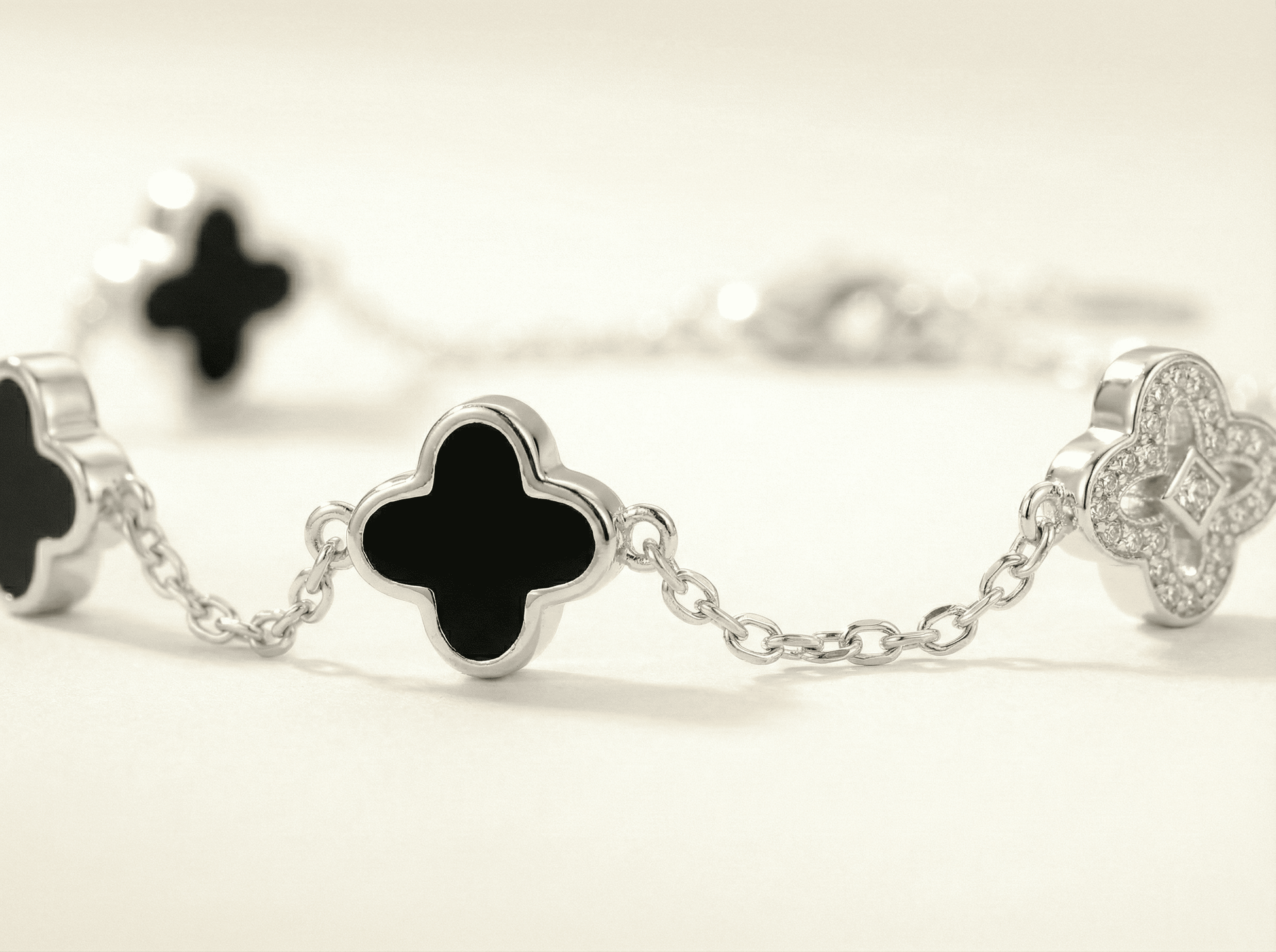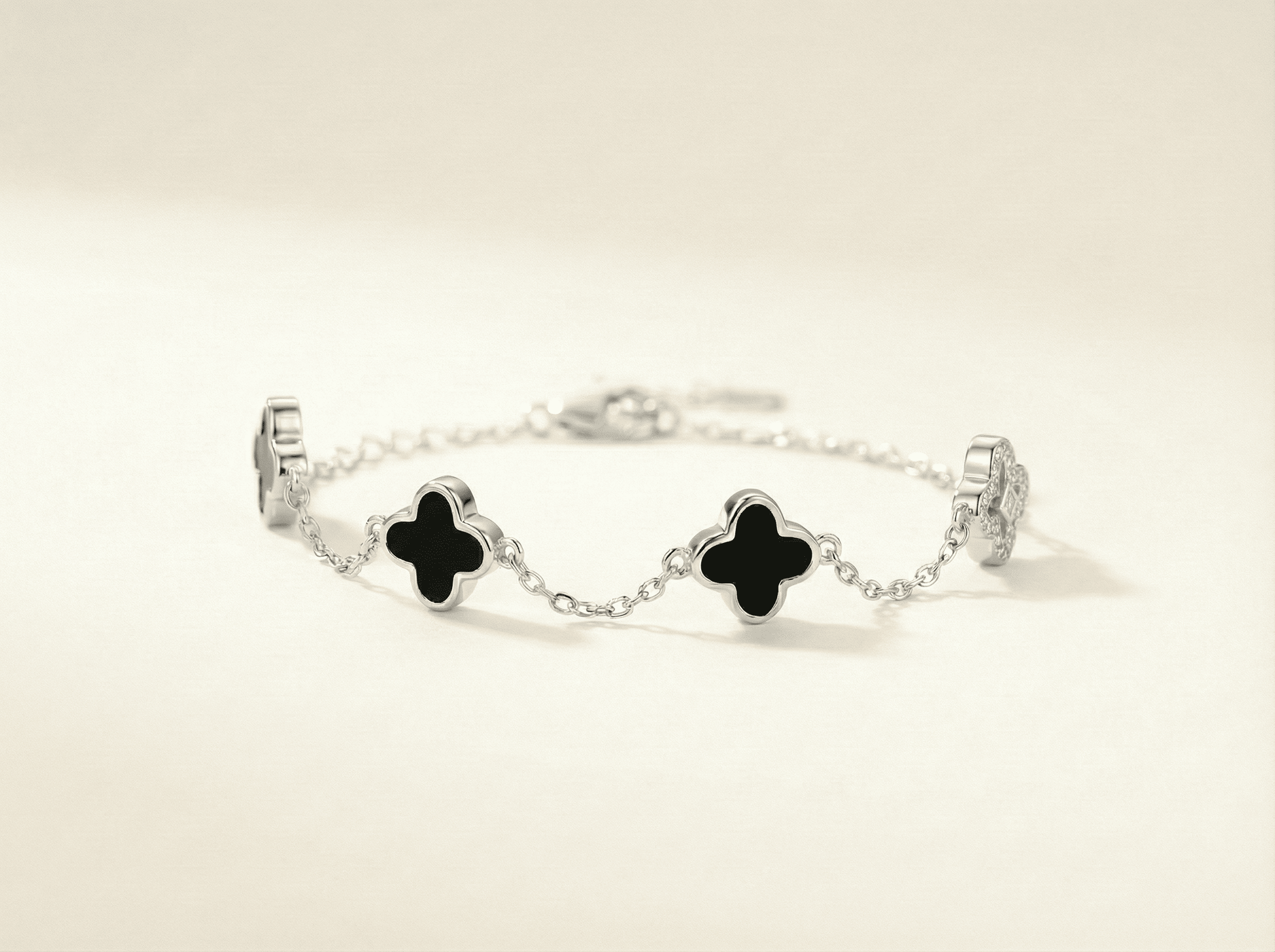 • Striking Contrast: Features three deep-black clover charms followed by a singular, brilliant diamond-set clover for a modern, high-contrast look.
