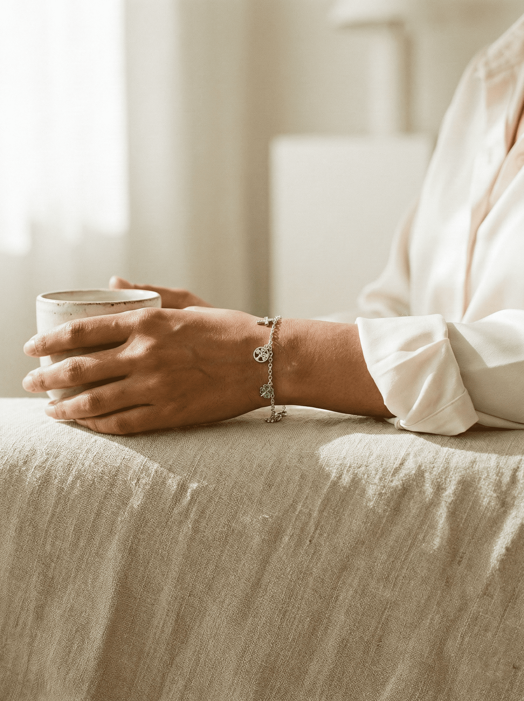 A poetic narrative for your wrist, the Eternal Journey Bracelet is a curated collection of life’s most meaningful milestones. This delicate piece weaves together four powerful symbols—the Tree of Life for growth, the Cross for faith, Green Clovers for luck, and the Infinity loop for eternal connection. Designed for the woman who carries her story with grace, each charm is meticulously crafted to catch the light, offering a sophisticated sparkle that transitions effortlessly from day to evening wear.