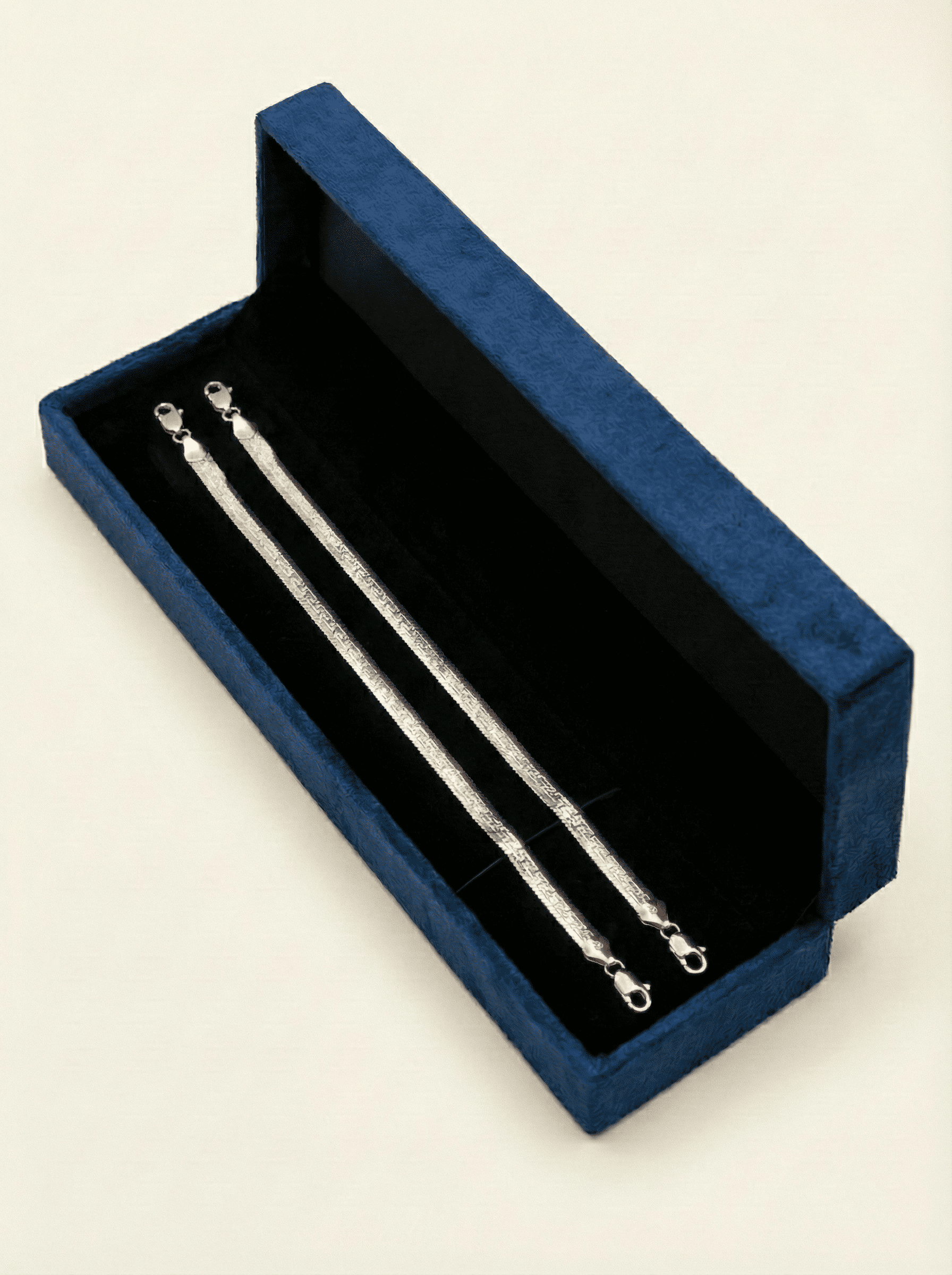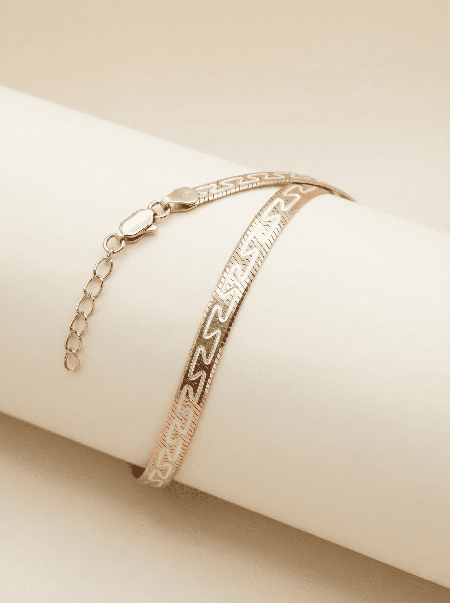 Capture the essence of timeless sophistication with a piece that blends ancient motifs with modern luxury. This anklet features a liquid-smooth herringbone chain adorned with a striking white Meander (Greek Key) pattern, symbolizing eternity and flow. Crafted for the woman who appreciates jewelry that feels as substantial as it looks.