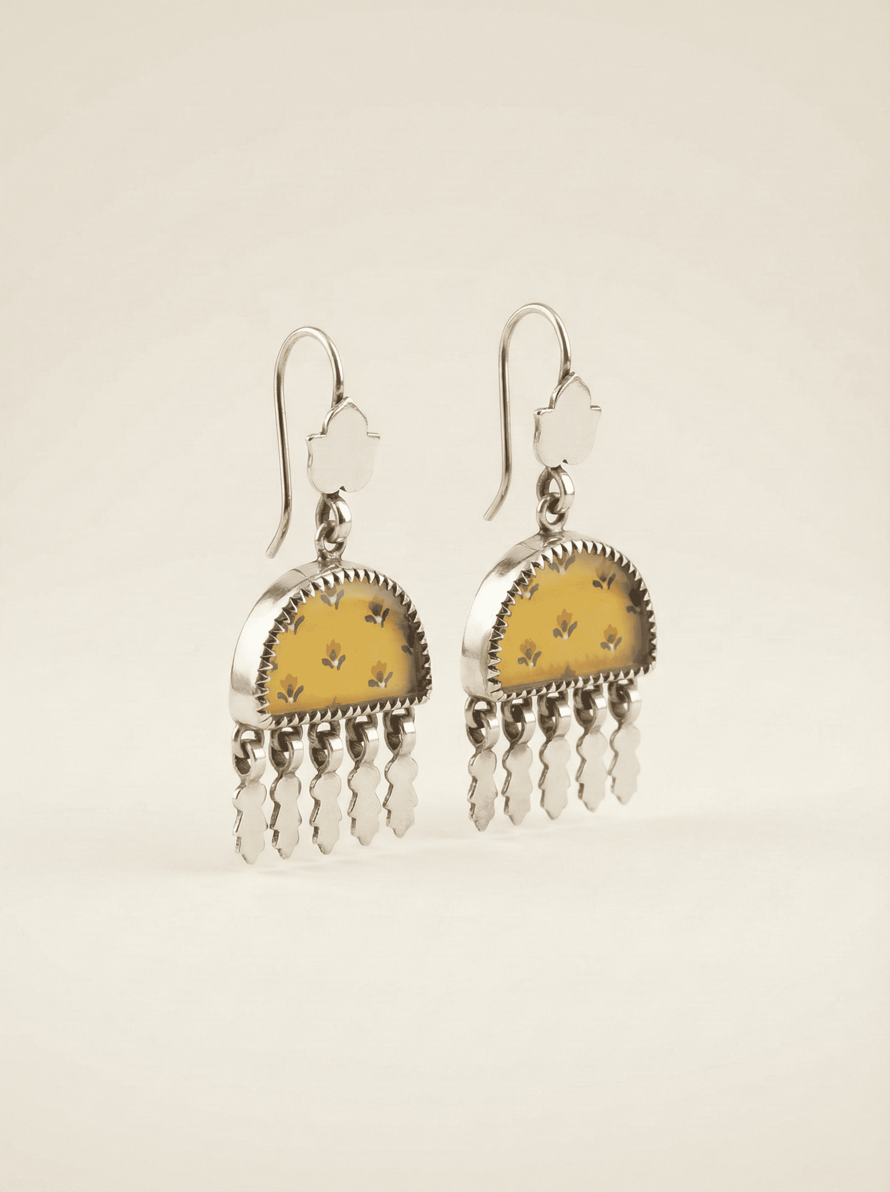 Capture the essence of a sun-drenched heritage garden with the Saffron Meadow Earrings. These pieces are a celebration of the "Chitrakaari" tradition, where fine miniature painting meets architectural silver-smithing. Each earring features a vibrant saffron-yellow enamel panel, hand-painted with delicate floral motifs that whisper of timeless elegance. Framed in a detailed, "tooth-edged" sterling silver bezel and finished with a rhythmic fringe of handcrafted silver charms, they offer a graceful, dancing movement with every turn of the head. These aren't just accessories; they are wearable pieces of art designed for the woman who finds beauty in the details.