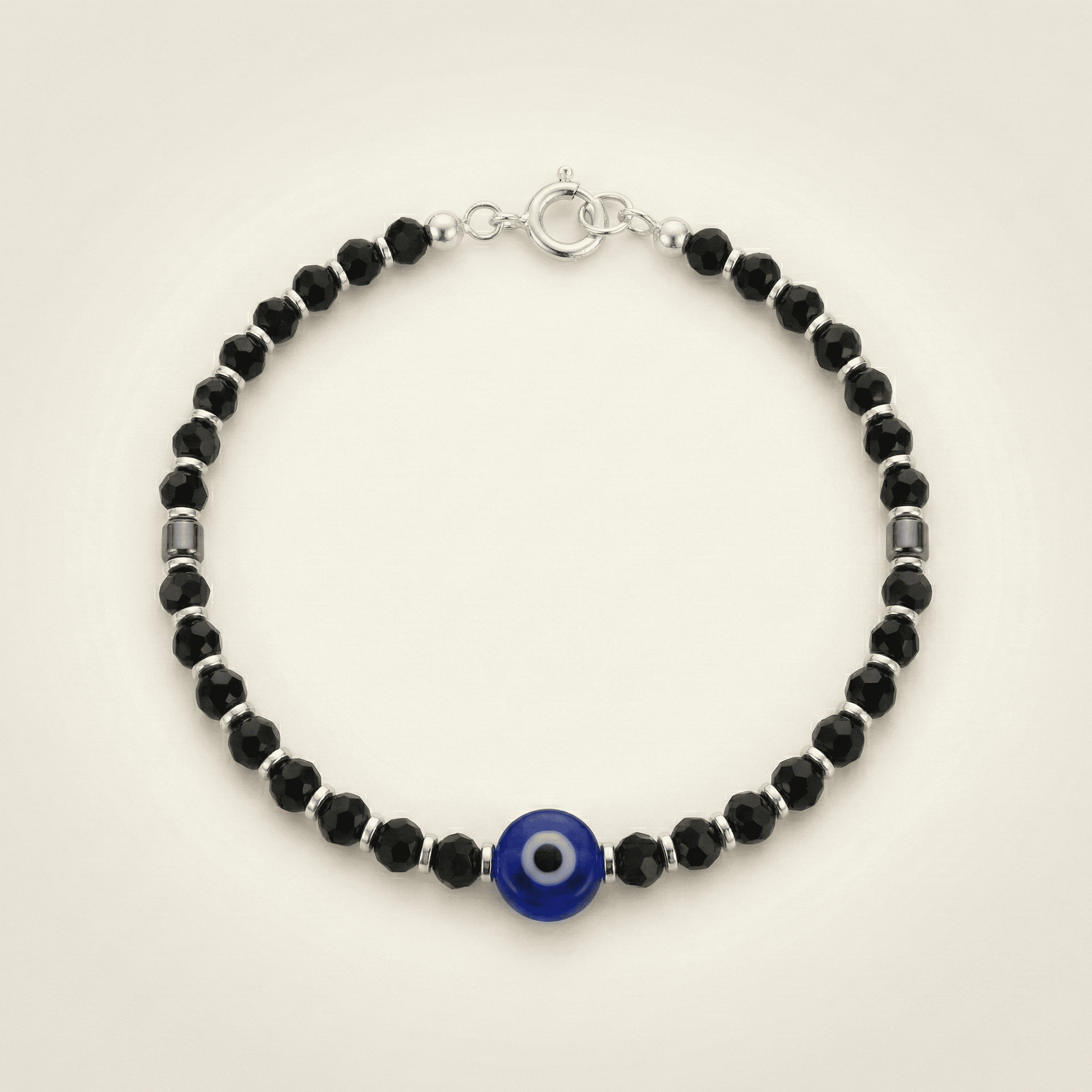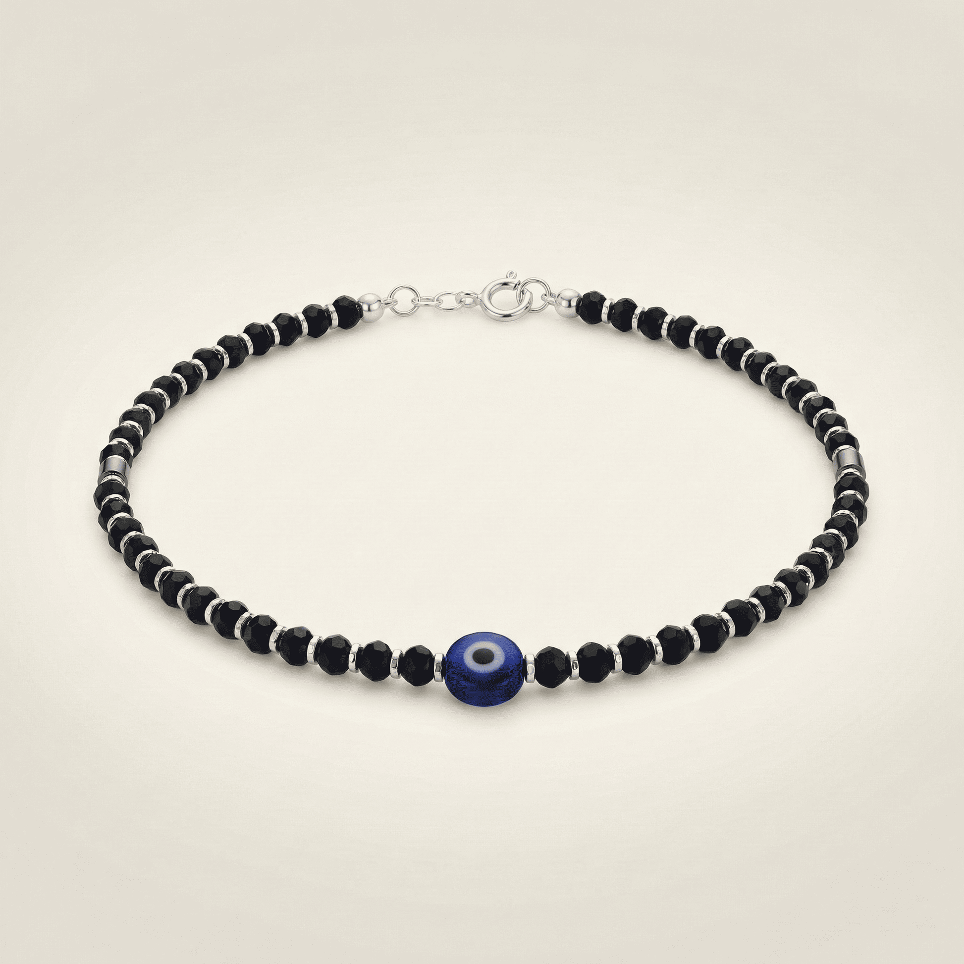 • Beads: Faceted Black Crystal/Spinel and Handcrafted Blue Glass Evil Eye.