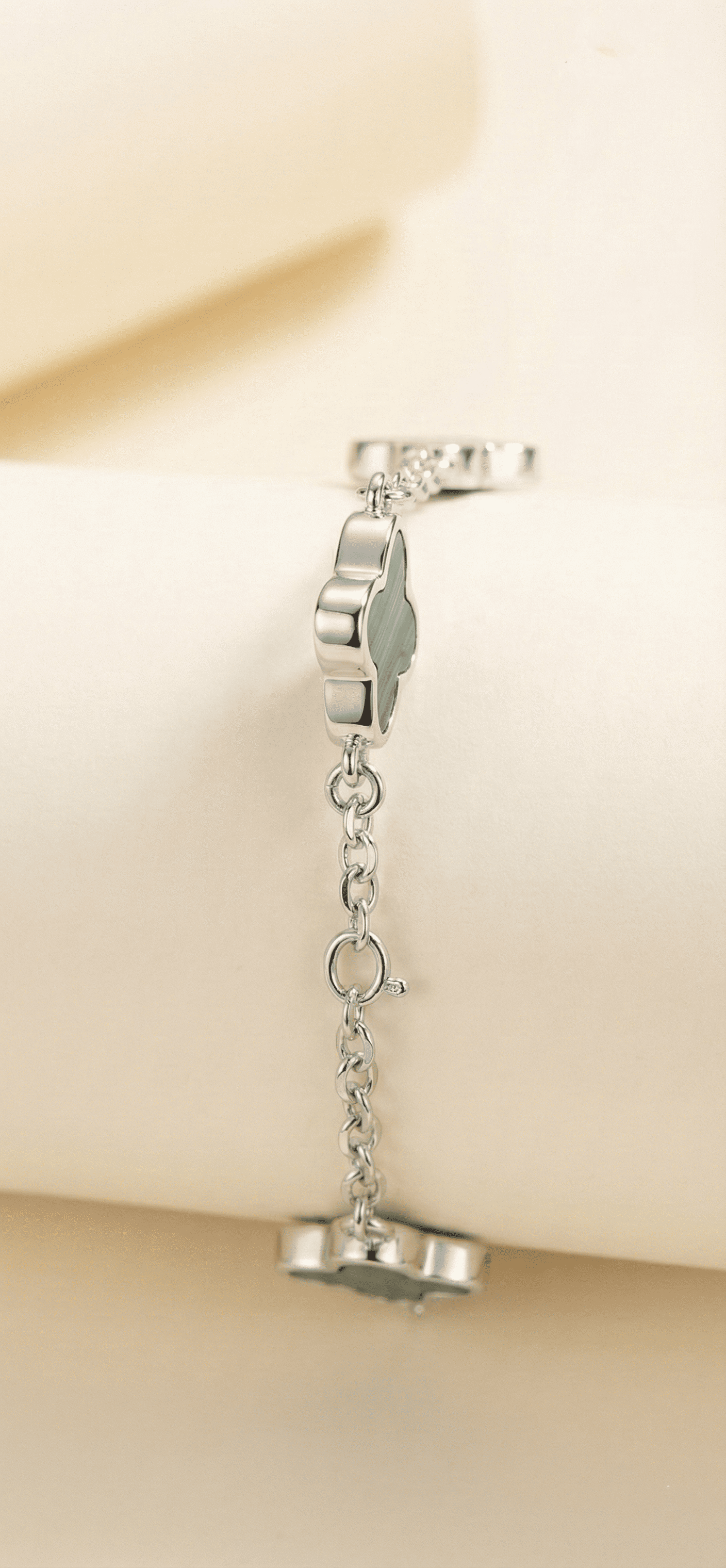 Embrace a legacy of luck and natural beauty with the Verdant Quadrifoil Bracelet. This centerpiece of the Moh Fine Jewellery collection features four hand-inlaid Malachite clovers, each meticulously framed in high-polish 925 sterling silver.
